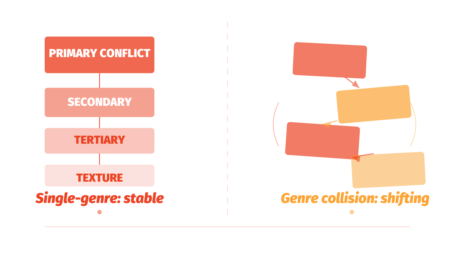 Single-genre stories operate with clear hierarchies. The primary conflict type receives the most attention. Secondary conflict types provide texture. A thriller might include internal conflict (the detective's addiction), but that conflict serves the external investigation. A romance might include external conflict (the competing families), but that conflict serves the relationship. The hierarchy is stable. Readers know what matters most.